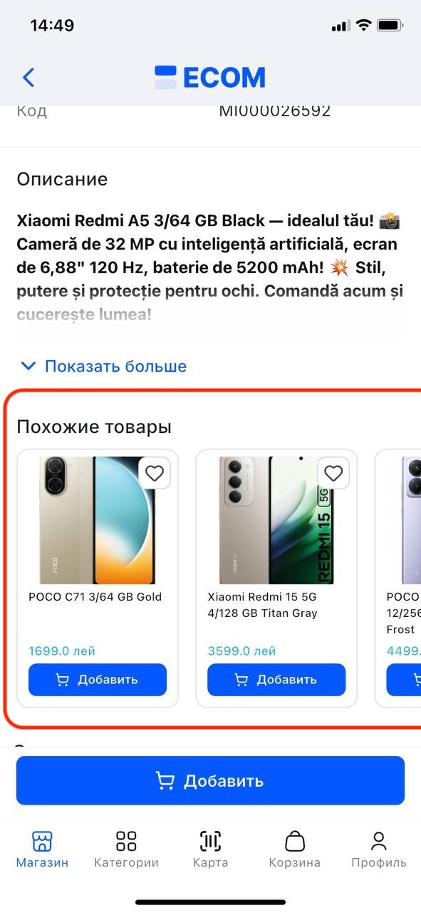 На странице товара отображается слайдер с похожими товарами для удобной навигации и выбора необходимого продукта.