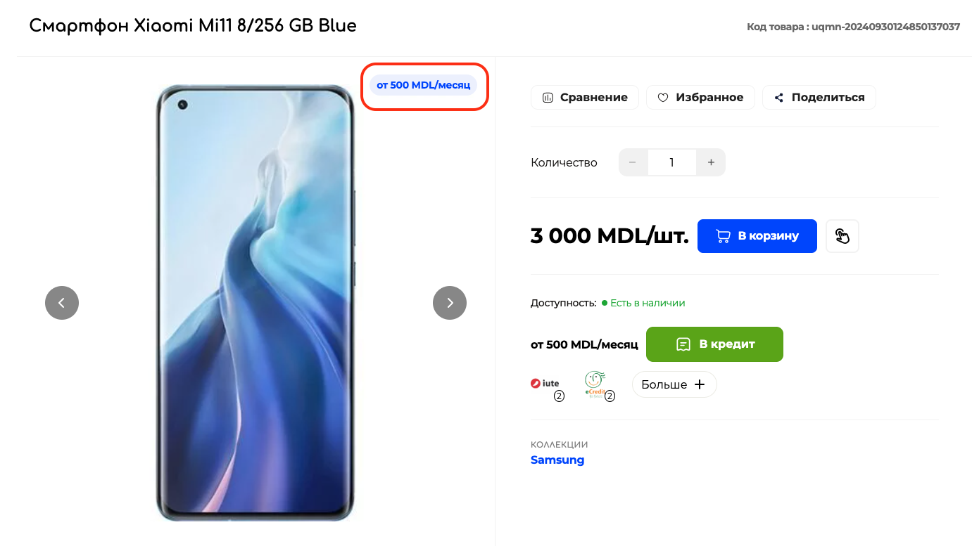 Информация о кредите дополнительно отображается прямо на изображении товара, обеспечивая быстрое и наглядное получение ключевых данных.
