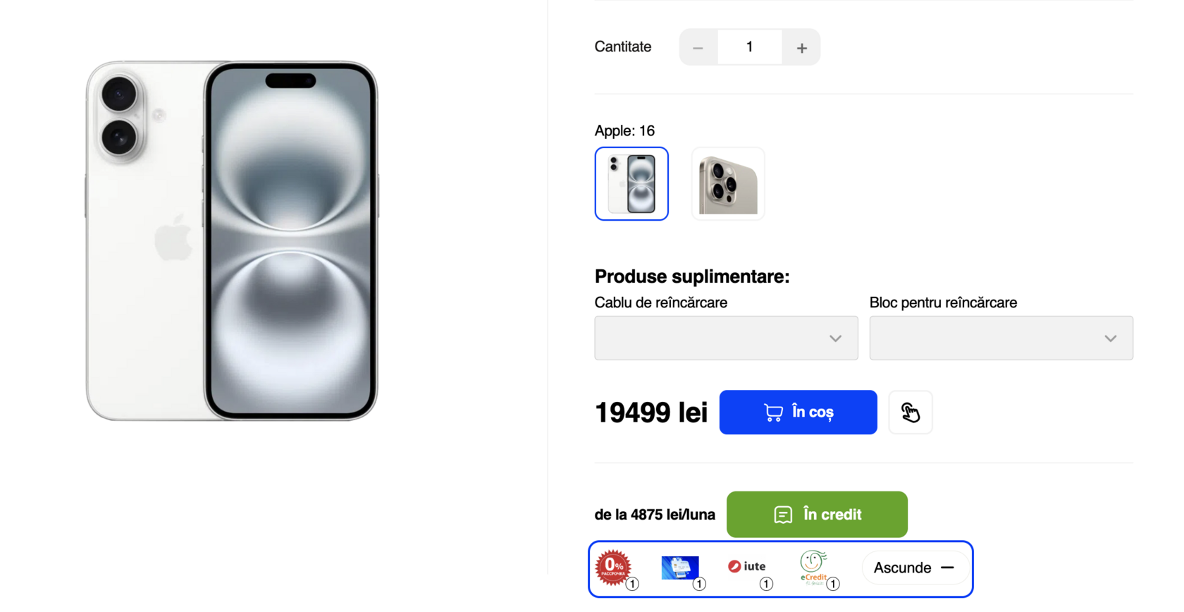 Pe pagina produsului au apărut iconițele companiilor de creditare. Treci cu mouse-ul - vezi condițiile, iar butonul „Mai multe” afișează toate opțiunile.