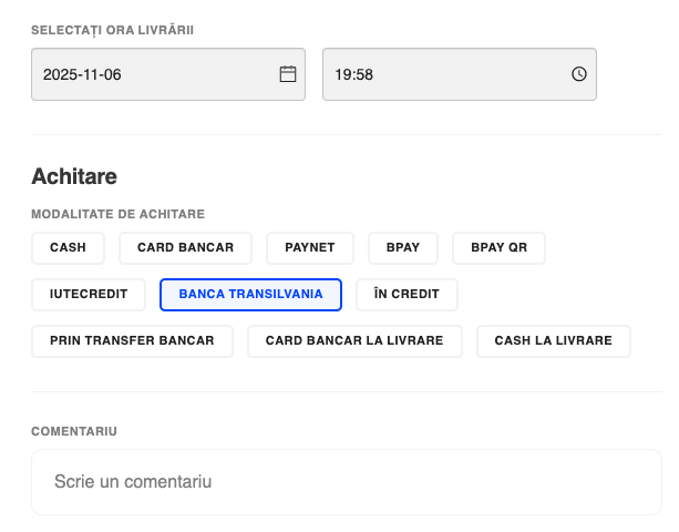 Posibilitatea achitării comenzilor online prin intermediul Băncii Transilvania (Ro) pentru a oferi clienților o metodă de plată online sigură și rapidă, conform standardelor bancare locale.