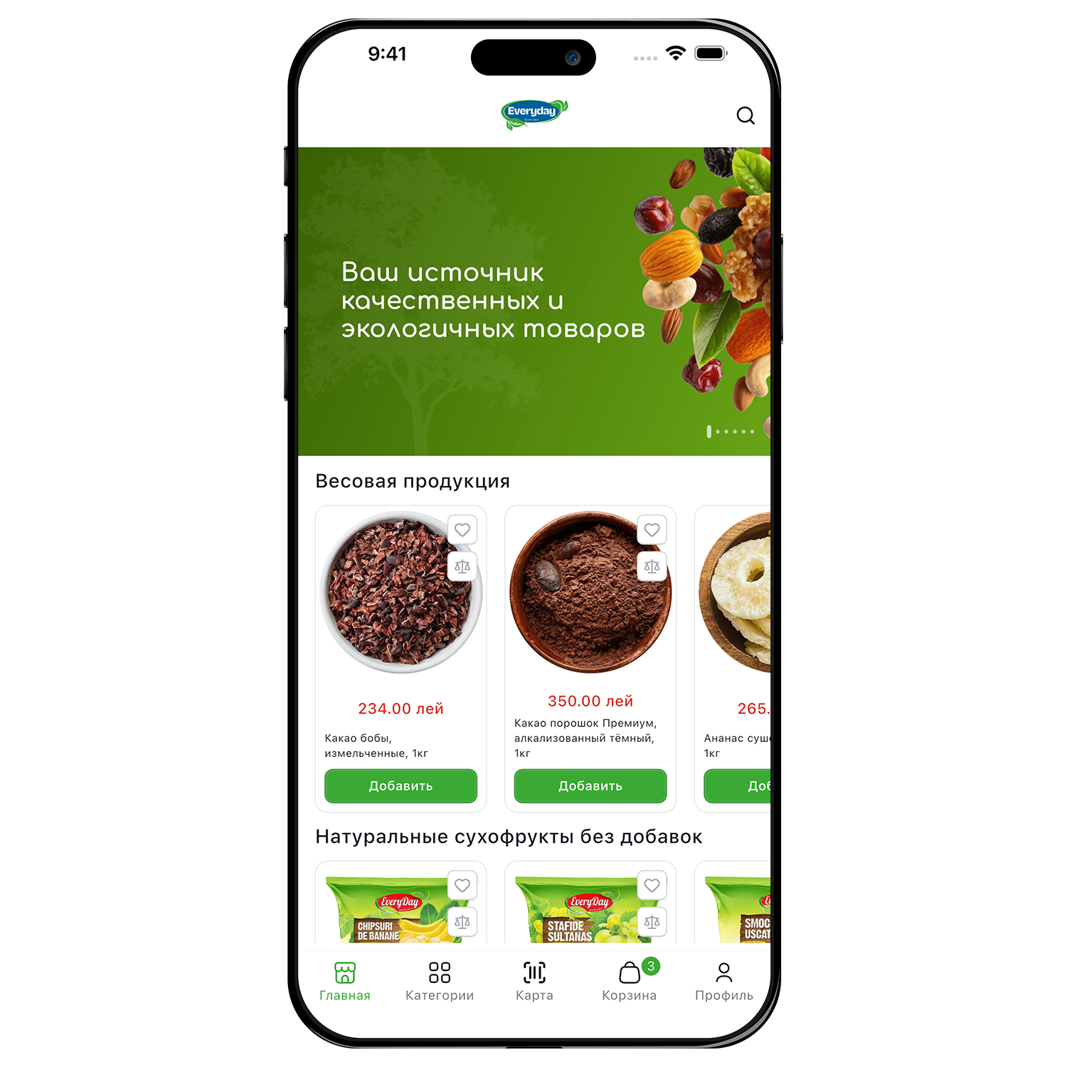 Everyday — удобное мобильное приложение, объединяющее широкий ассортимент сухофруктов, орехов, семечек, цукатов, бобовых, круп и масел холодного отжима от проверенных мировых поставщиков.