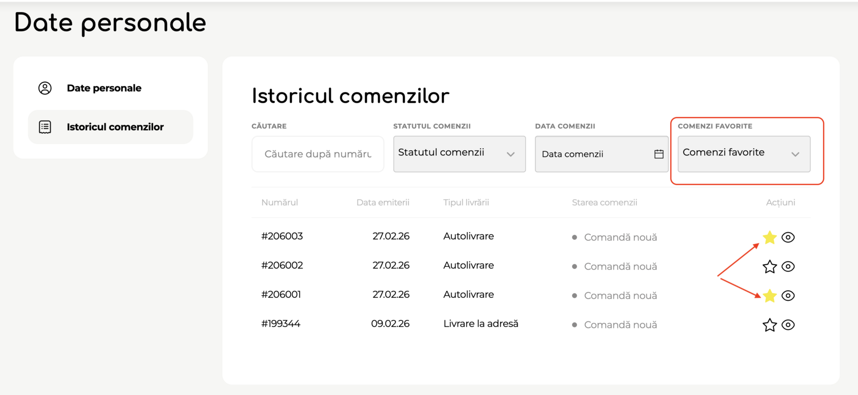 Posibilitatea de a indica comenzile favorite pentru o sortare comodă în continuare și accesul facil la acestea pentru refacerea în cîteva clicuri.
