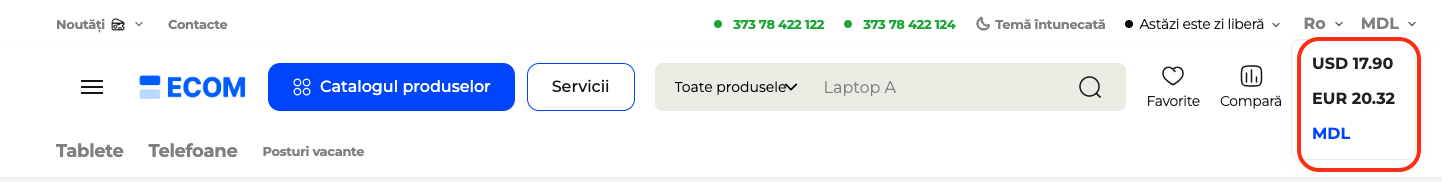 Convertirea prețurilor produselor pe site în diferite valute pentru a opera pe mai multe piețe și pentru a afișa prețurile în moneda convenabilă pentru client.