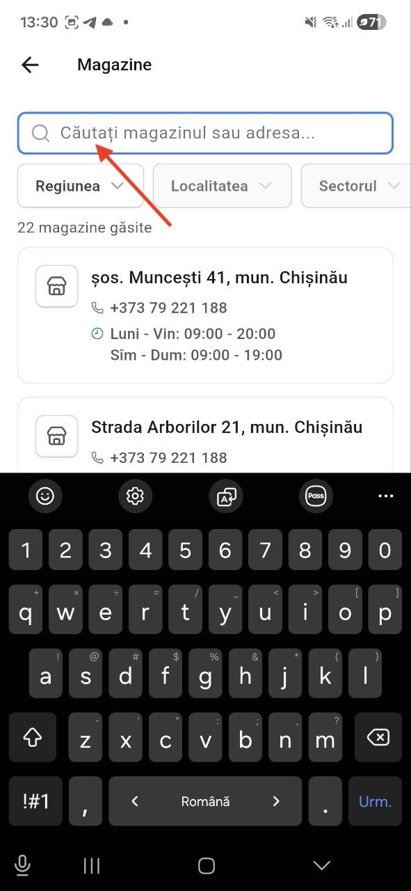Posibilitatea de a căuta locația necesară din lista mare de magazine pentru identificarea rapidă a locațiilor fizice și facilitarea accesului la informații despre acestea.